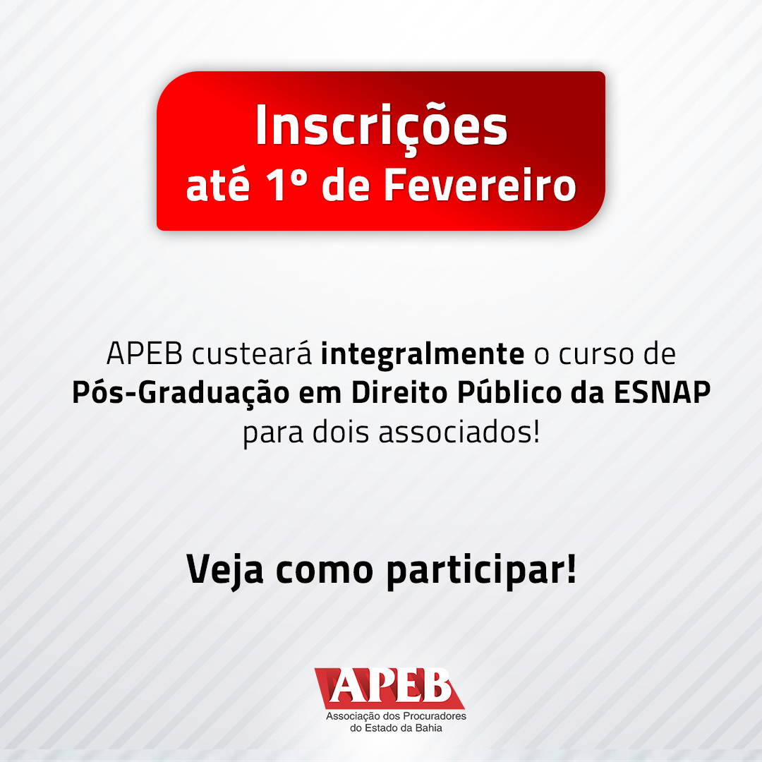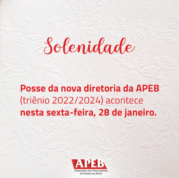 É com muita honra que a APEB comunica o evento de posse da nova diretoria, que conta com os procuradores Cinthya Viana Freire Fingergut e Arlley Cavalcante de Oliveira na presidência e