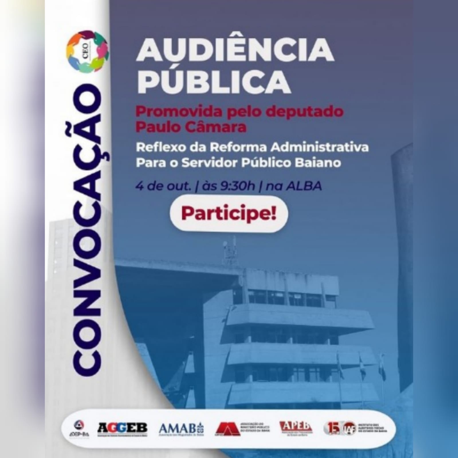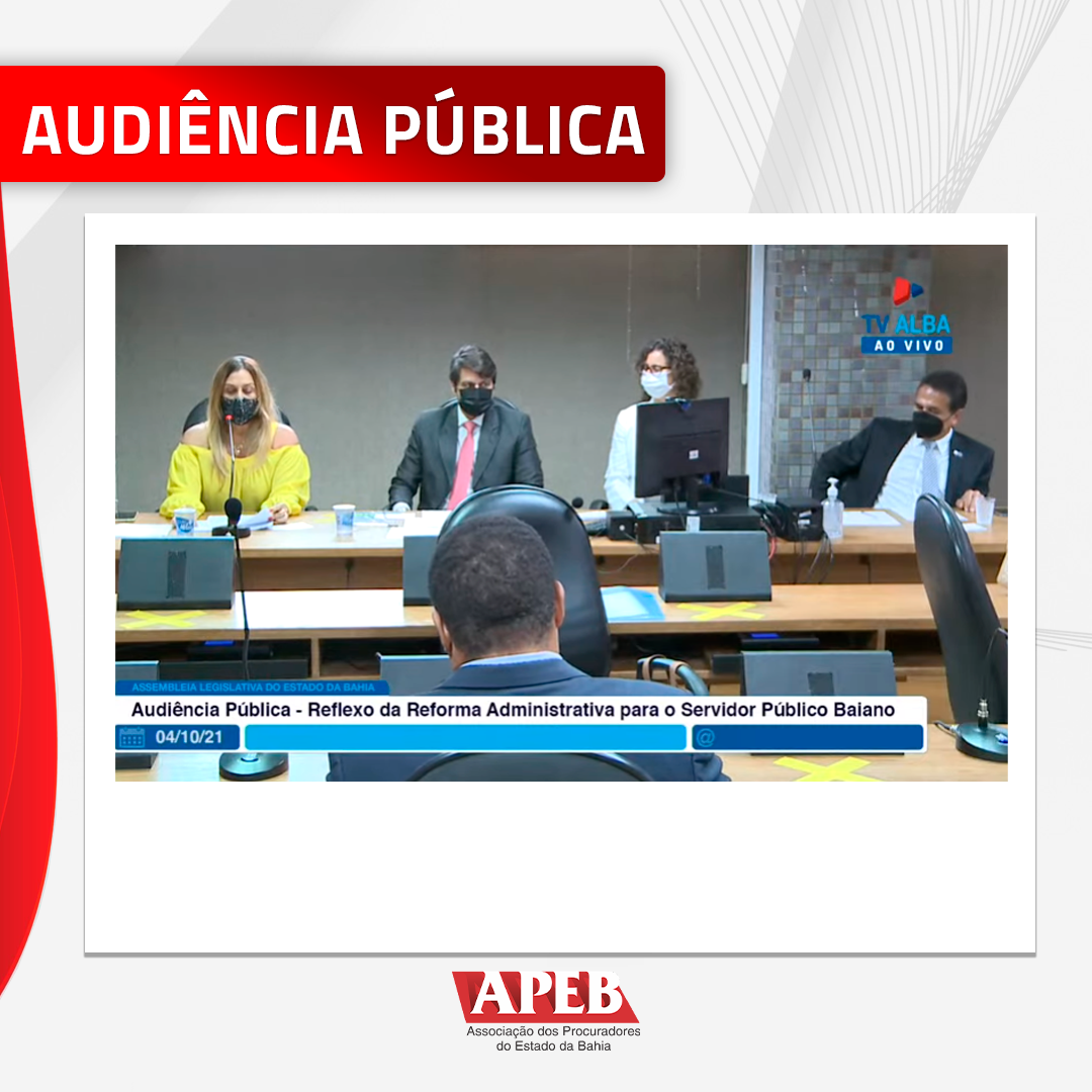 A APEB, entidade integrante do grupo Carreiras de Estado Organizadas (CEO), participou nesta segunda-feira, 04 de outubro, de uma audiência pública na Assembleia Legislativa da Bahia (