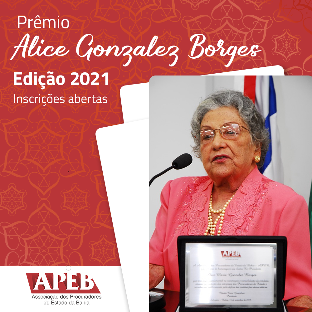 Vai até o dia 31 de maio o prazo de inscrições para o Prêmio Alice Gonzalez Borges. Os trabalhos admitidos consistirão em monografia, artigo científico, est