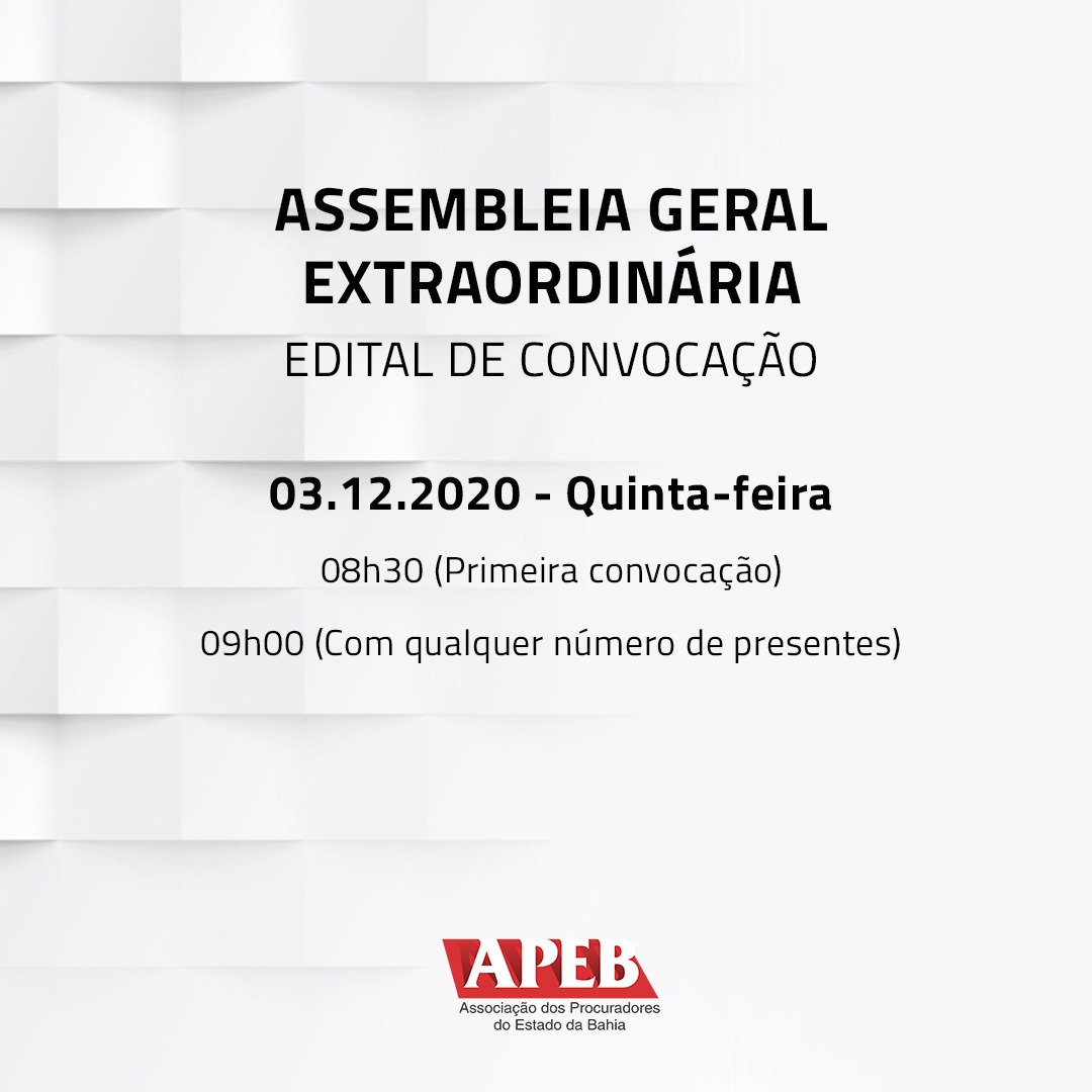 Ficam convocados os associados da APEB para a Assembleia Geral Extraordinária a ser realizada por videoconferência nesta quinta-feira, 03 de dezembro de 2020, às 08h30, em prime